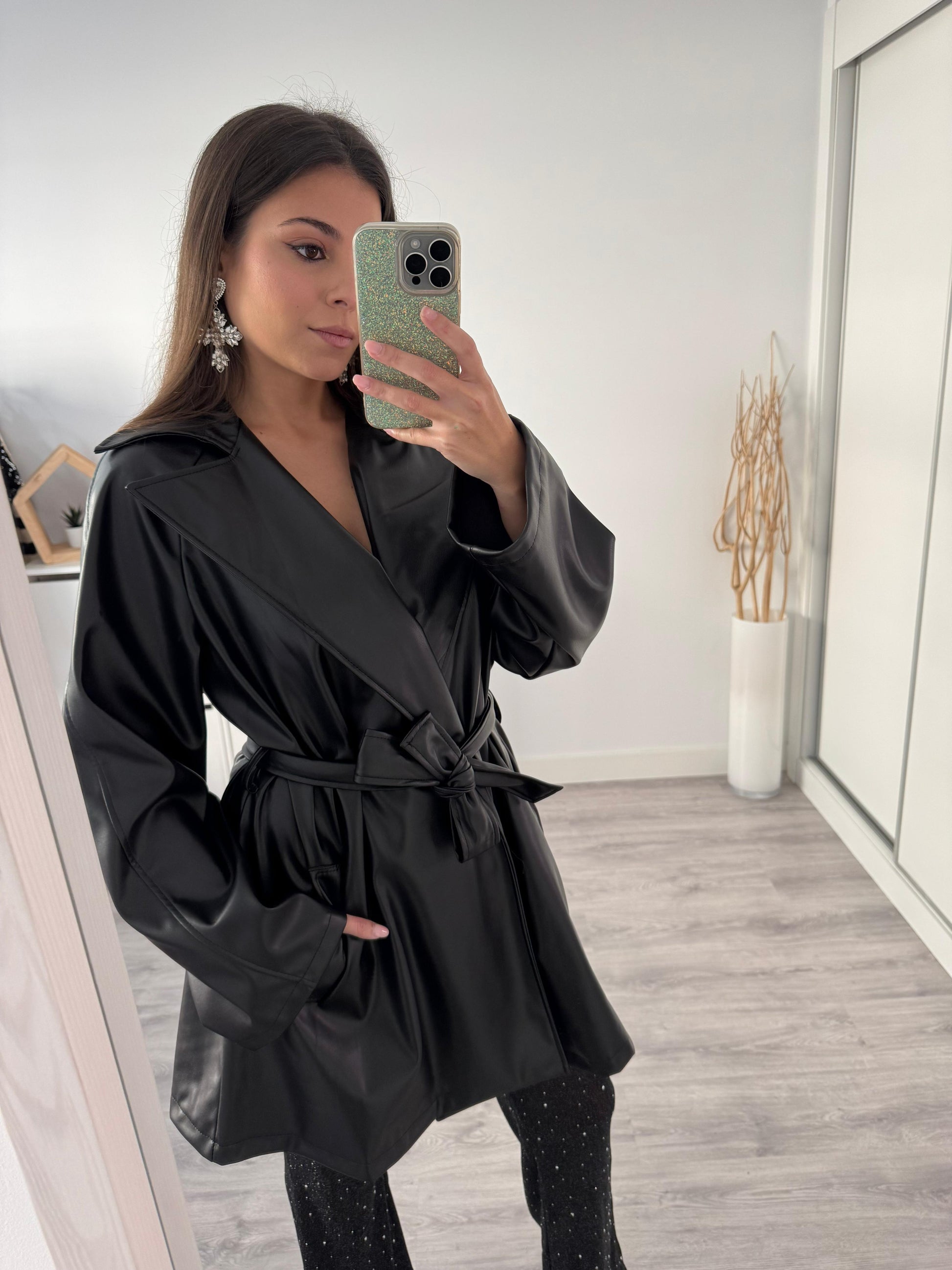El corte fluido, junto con el cinturón ajustable, realza la figura marcando la silueta sin perder comodidad. Las mangas amplias y el cuello tipo solapa le dan un aire sofisticado y actual.
