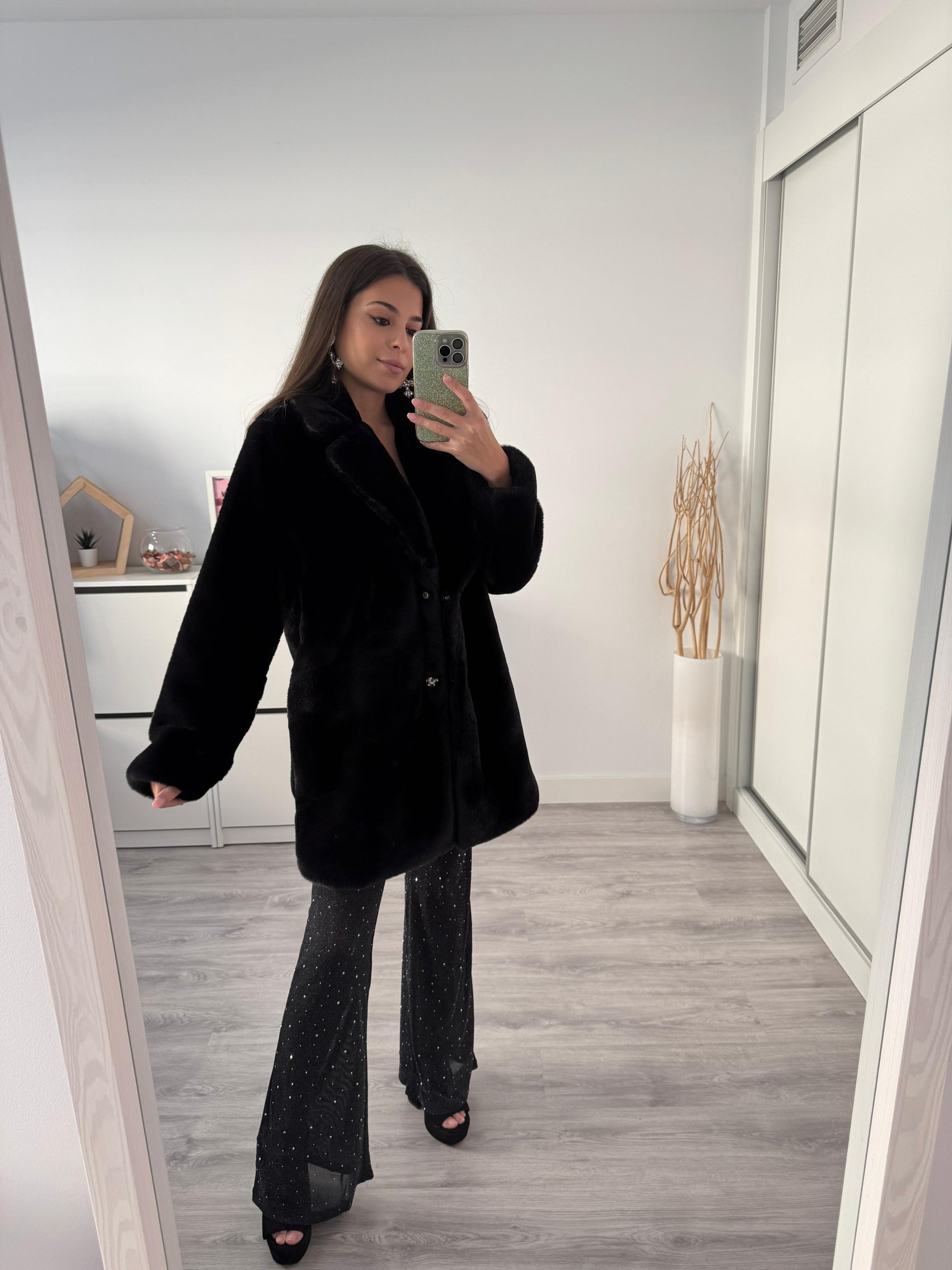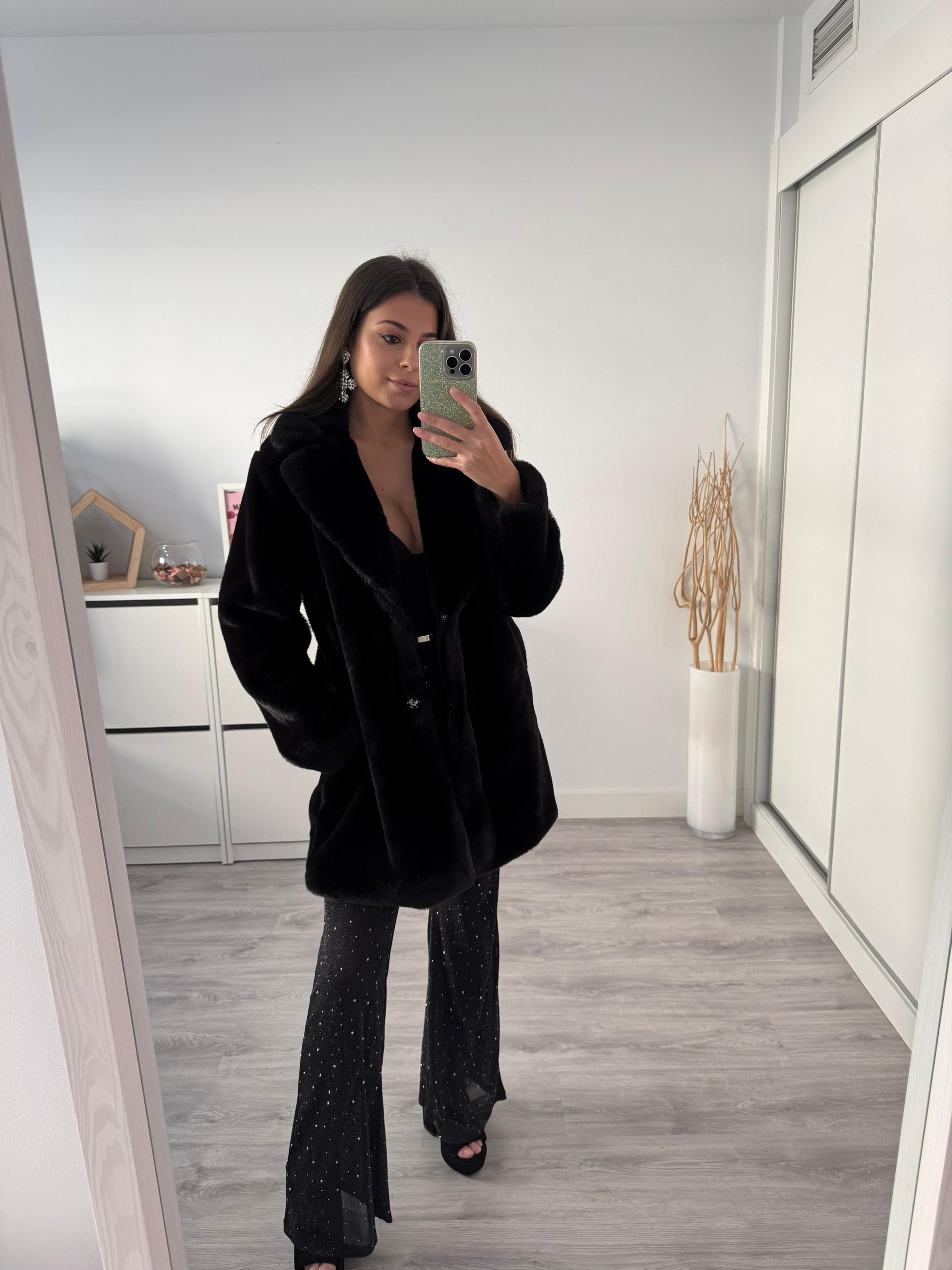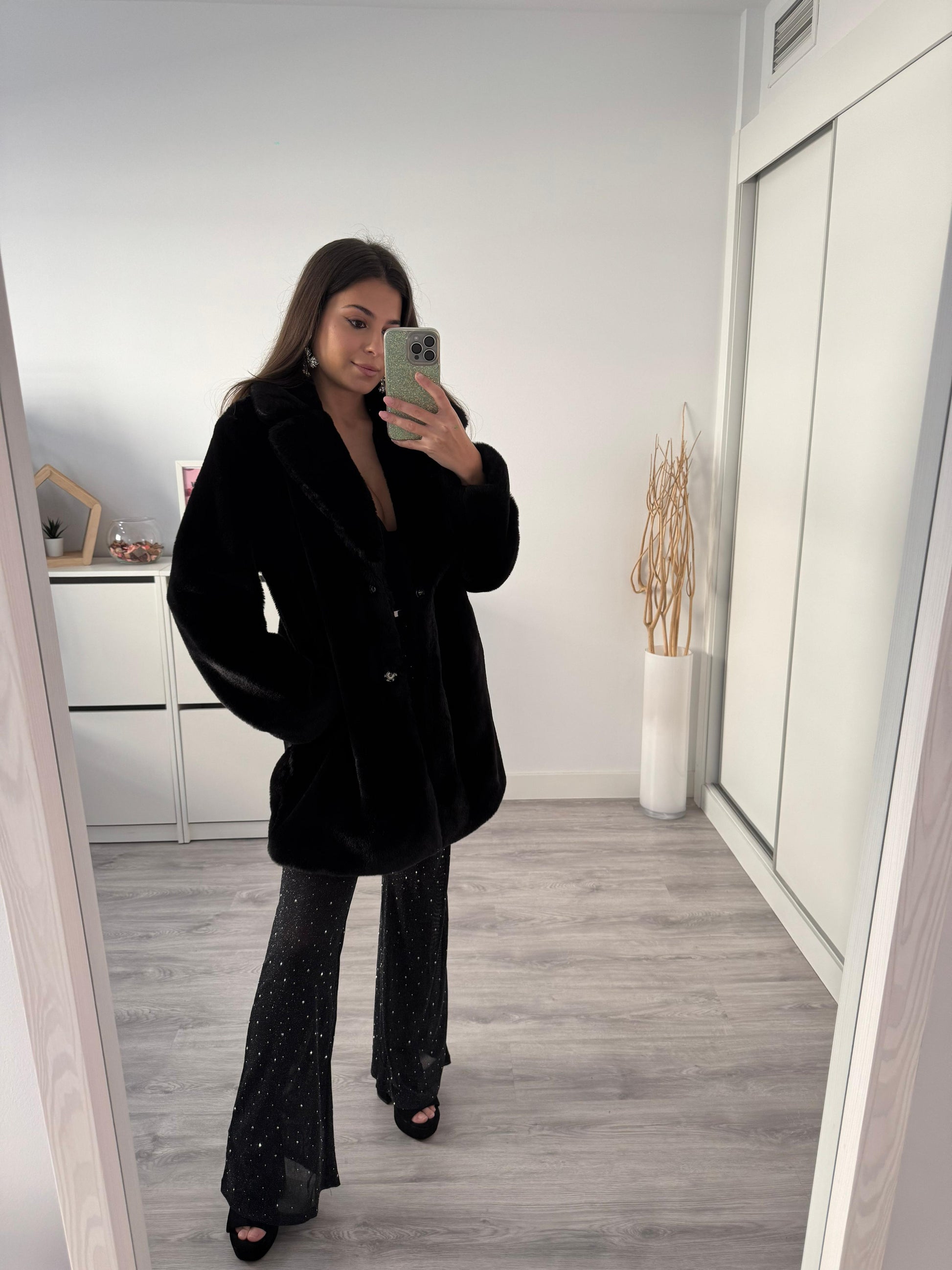 Su silueta holgada permite combinarlo con todo desde looks de noche con brillo hasta conjuntos más casual con vaqueros o botas Es ese abrigo que transmite presencia sin esfuerzo y eleva cualquier conjunto al instante