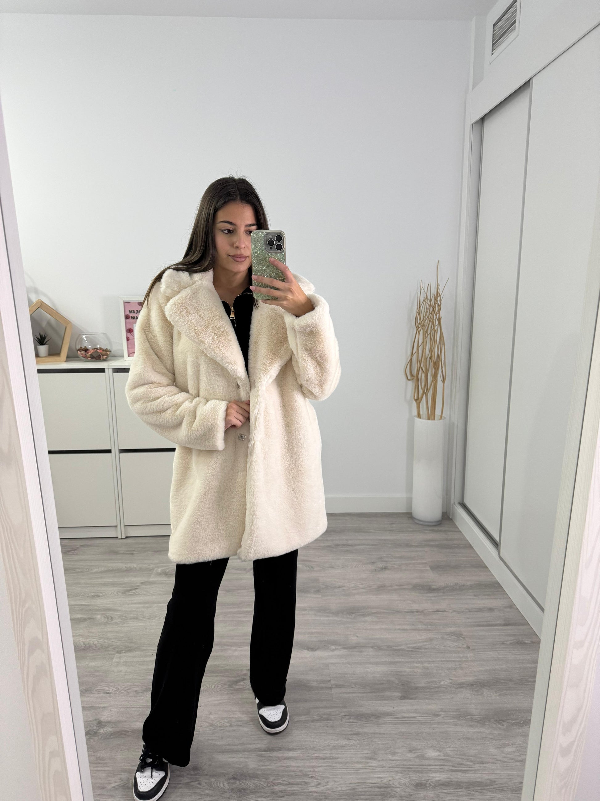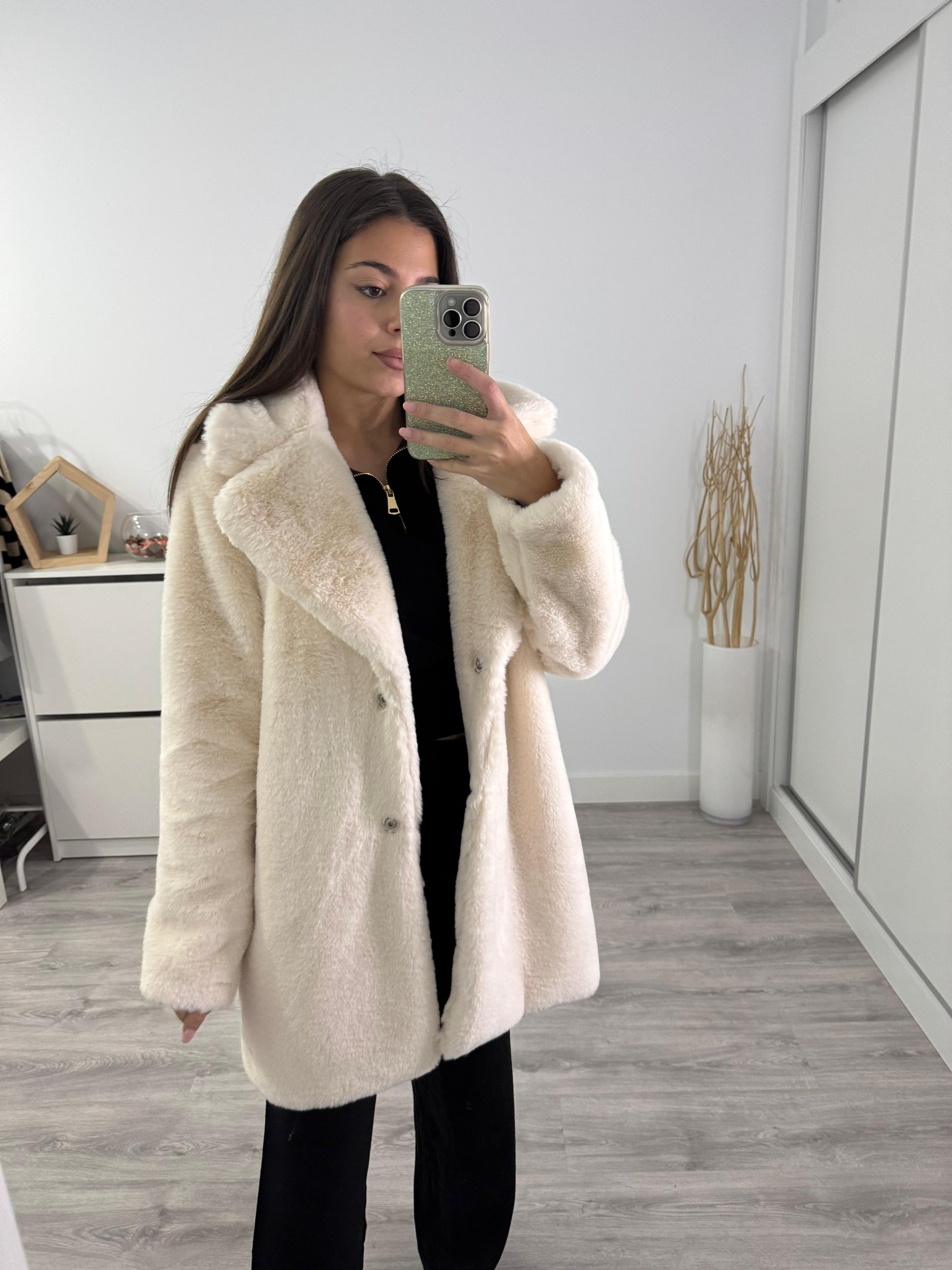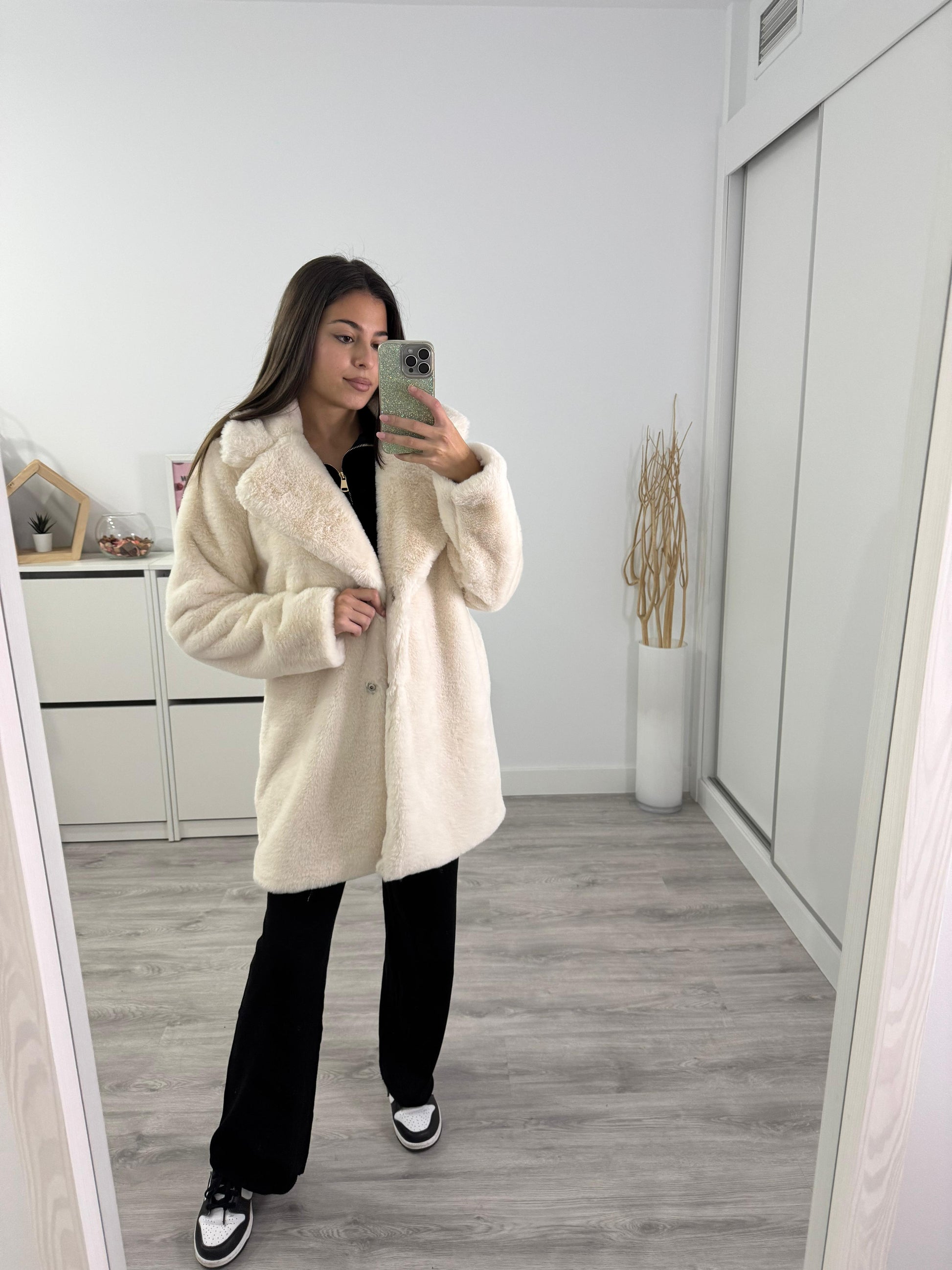 El Abrigo Sofía es sinónimo de elegancia y calidez Su diseño en pelo sintético color crema envuelve el cuerpo con suavidad y ligereza aportando ese toque de lujo que eleva cualquier look de invierno El corte recto y su cuello solapa ancho crean una silueta favorecedora y atemporal mientras que su textura ultrasuave transmite confort y sofisticación en cada movimiento