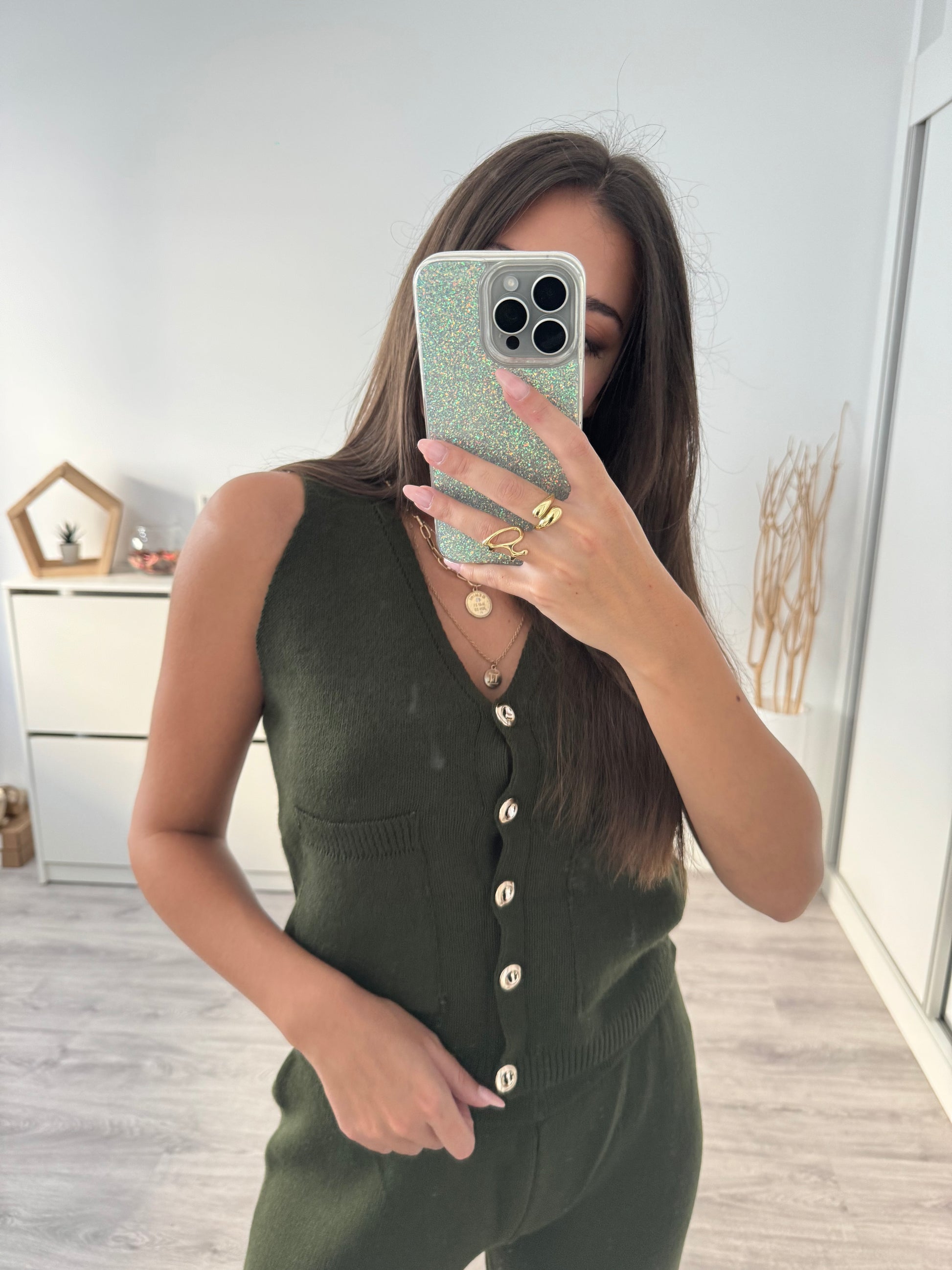 El top sin mangas con escote en pico y botones frontales aporta un aire sofisticado y moderno, mientras que el pantalón de tiro alto con caída recta estiliza la figura manteniendo la comodidad en cada movimiento.