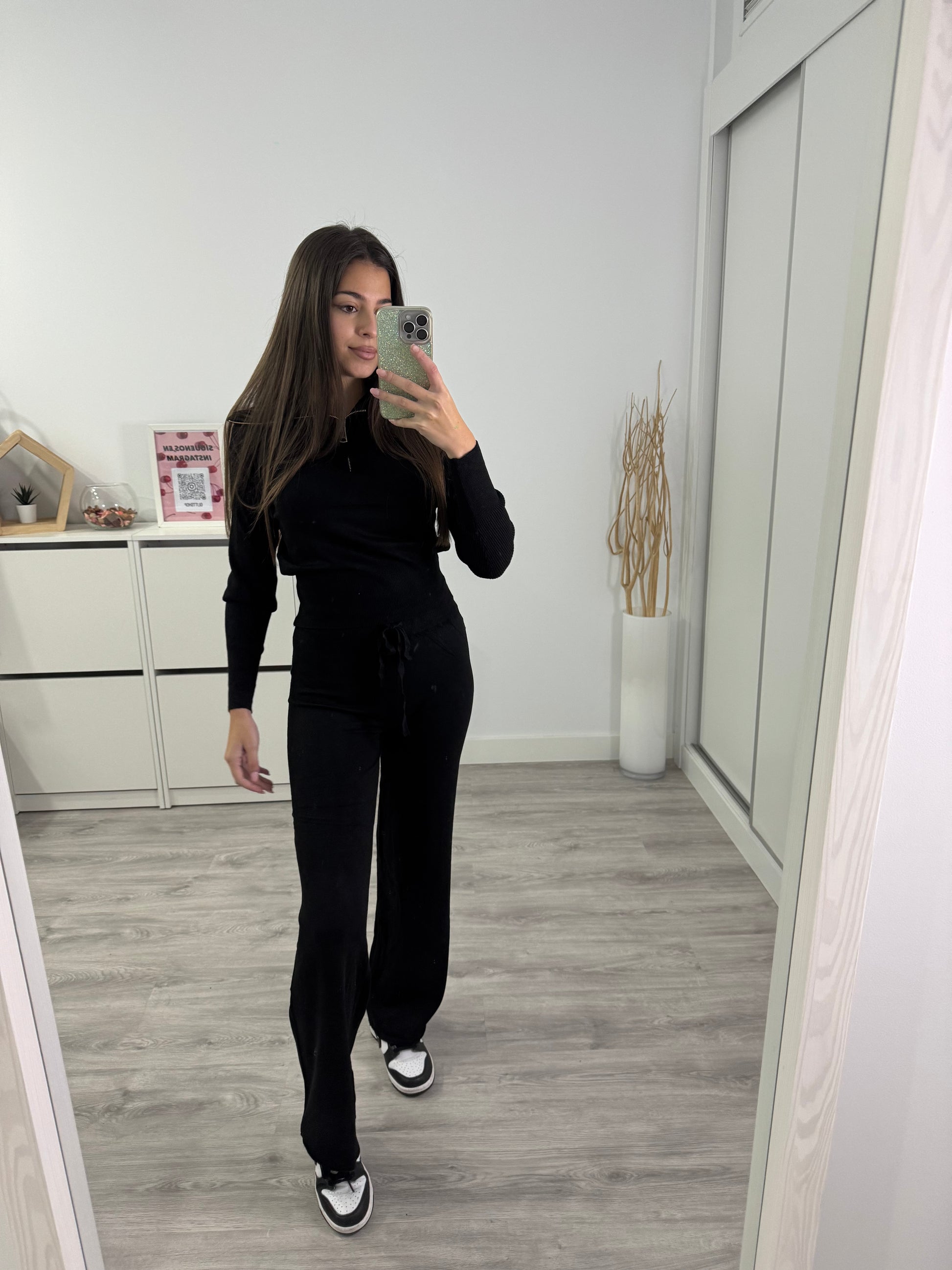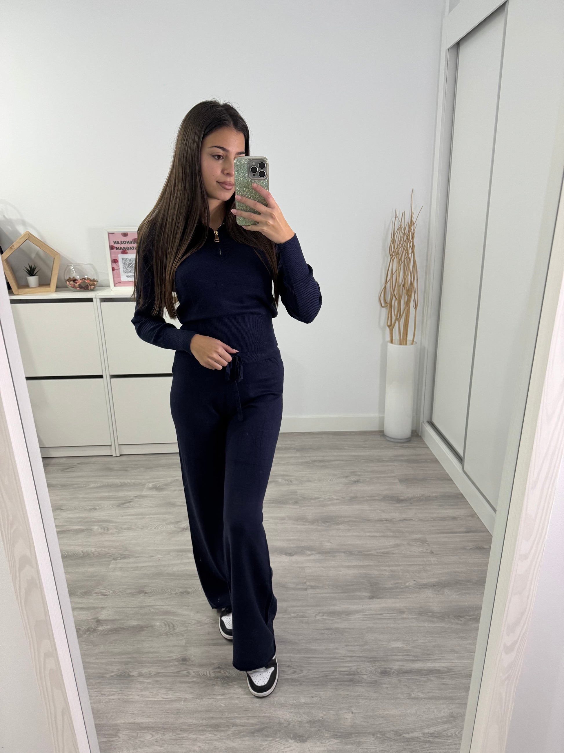 El conjunto está formado por un top de manga larga con cremallera y cuello ligeramente abierto, que aporta un toque moderno y favorecedor, y un pantalón de tiro alto con cintura ajustable mediante cordón y caída fluida. Su diseño equilibra la comodidad de un conjunto casual con el estilo cuidado de una prenda versátil y sofisticada.