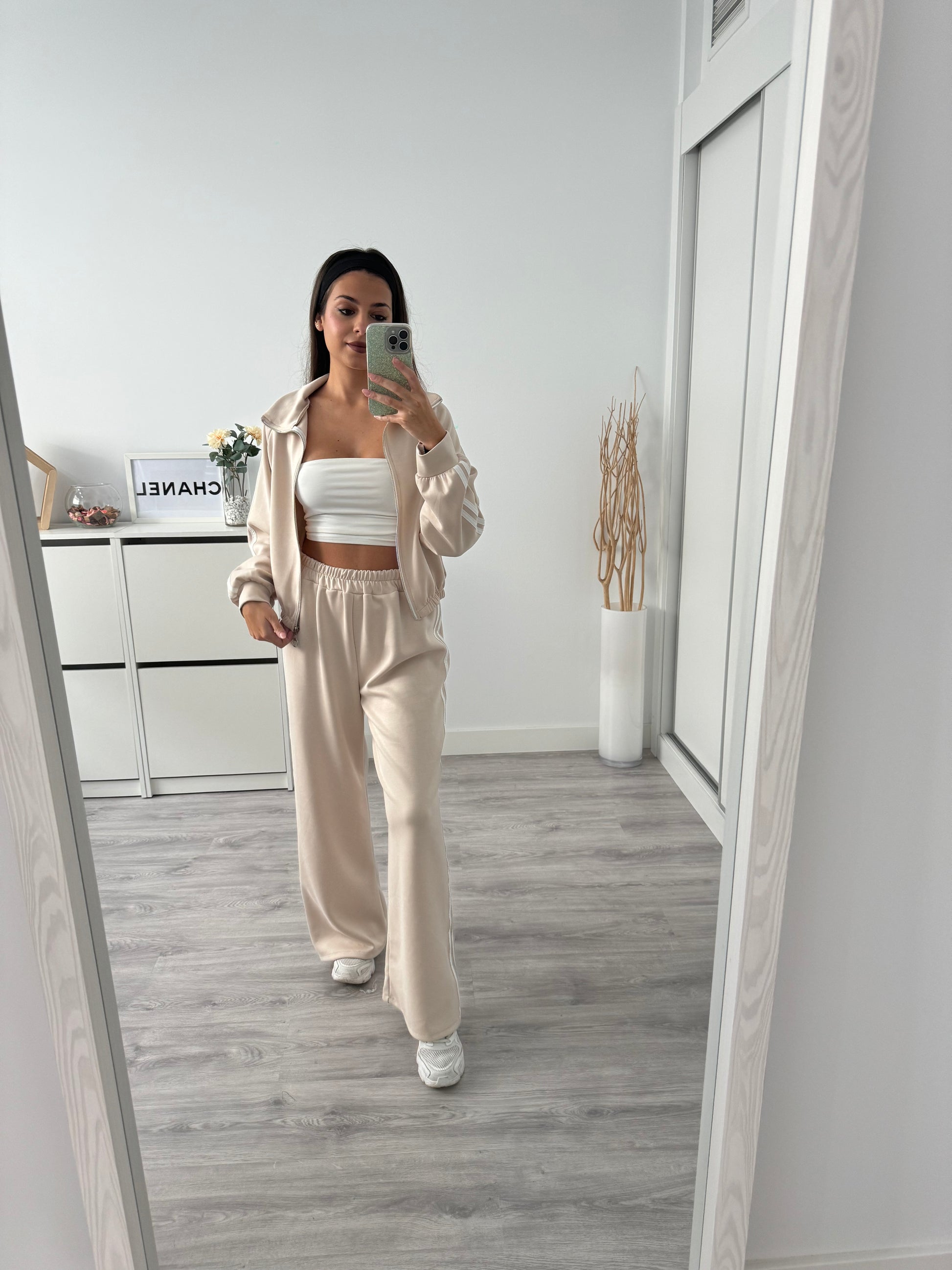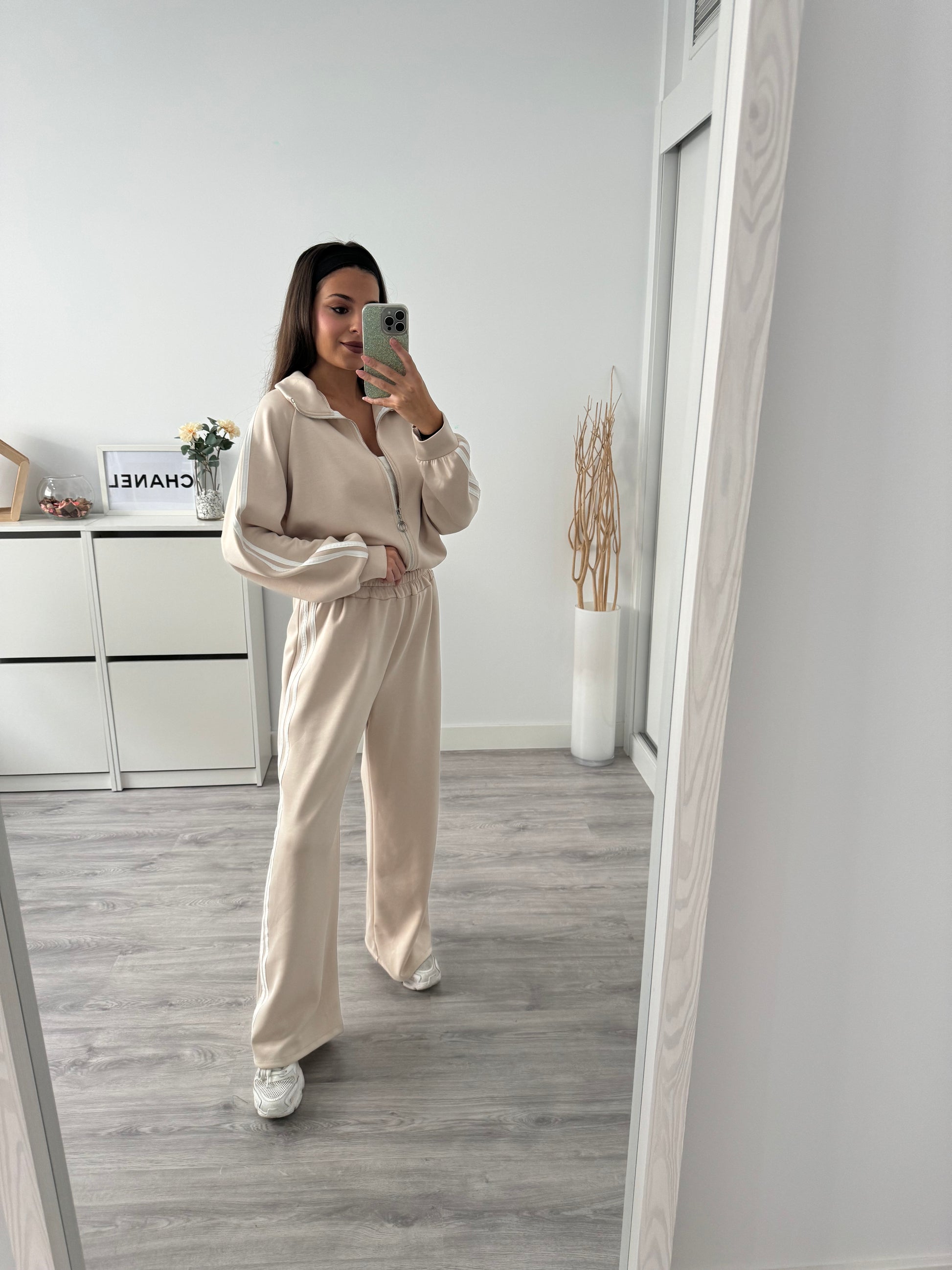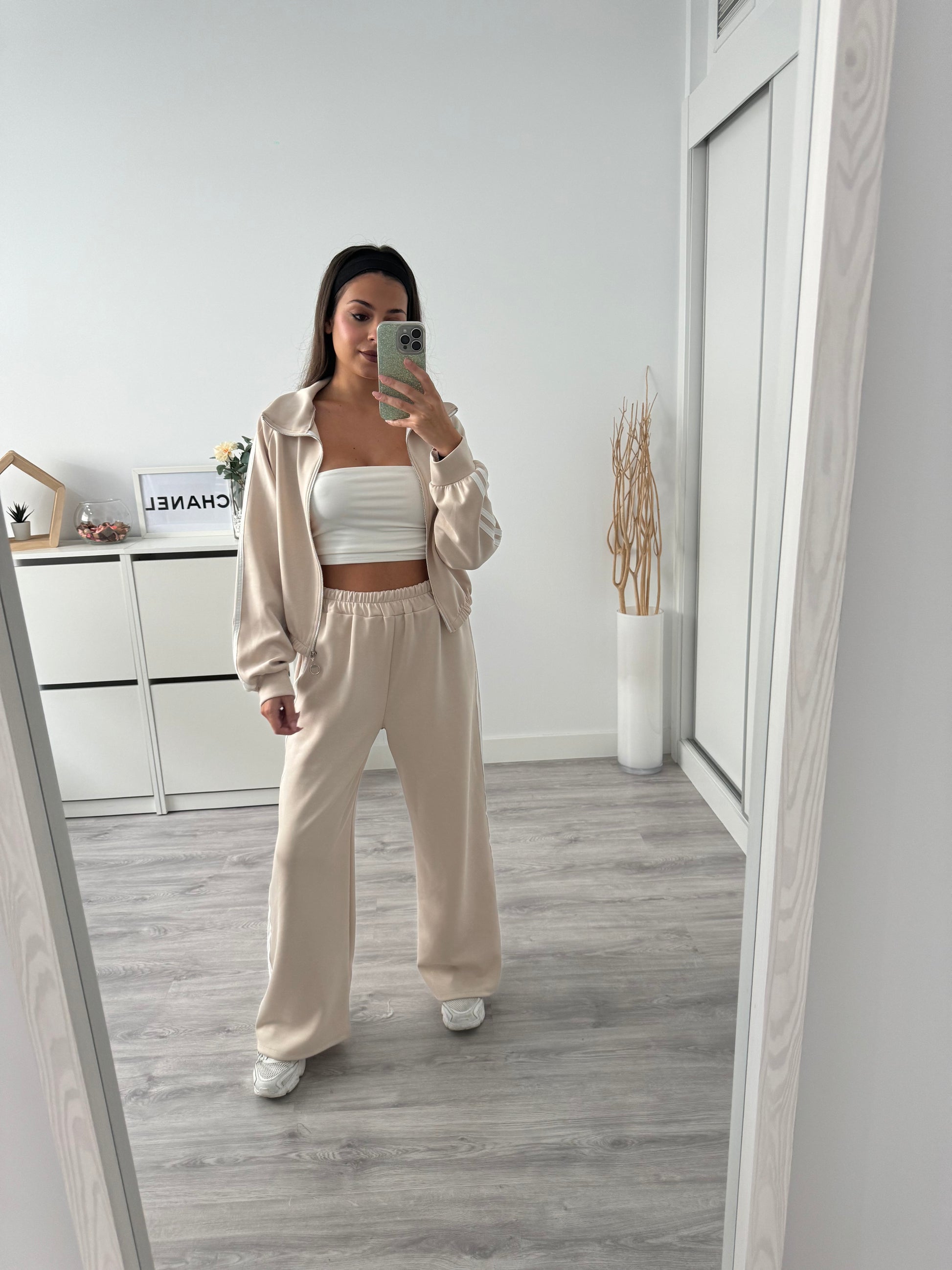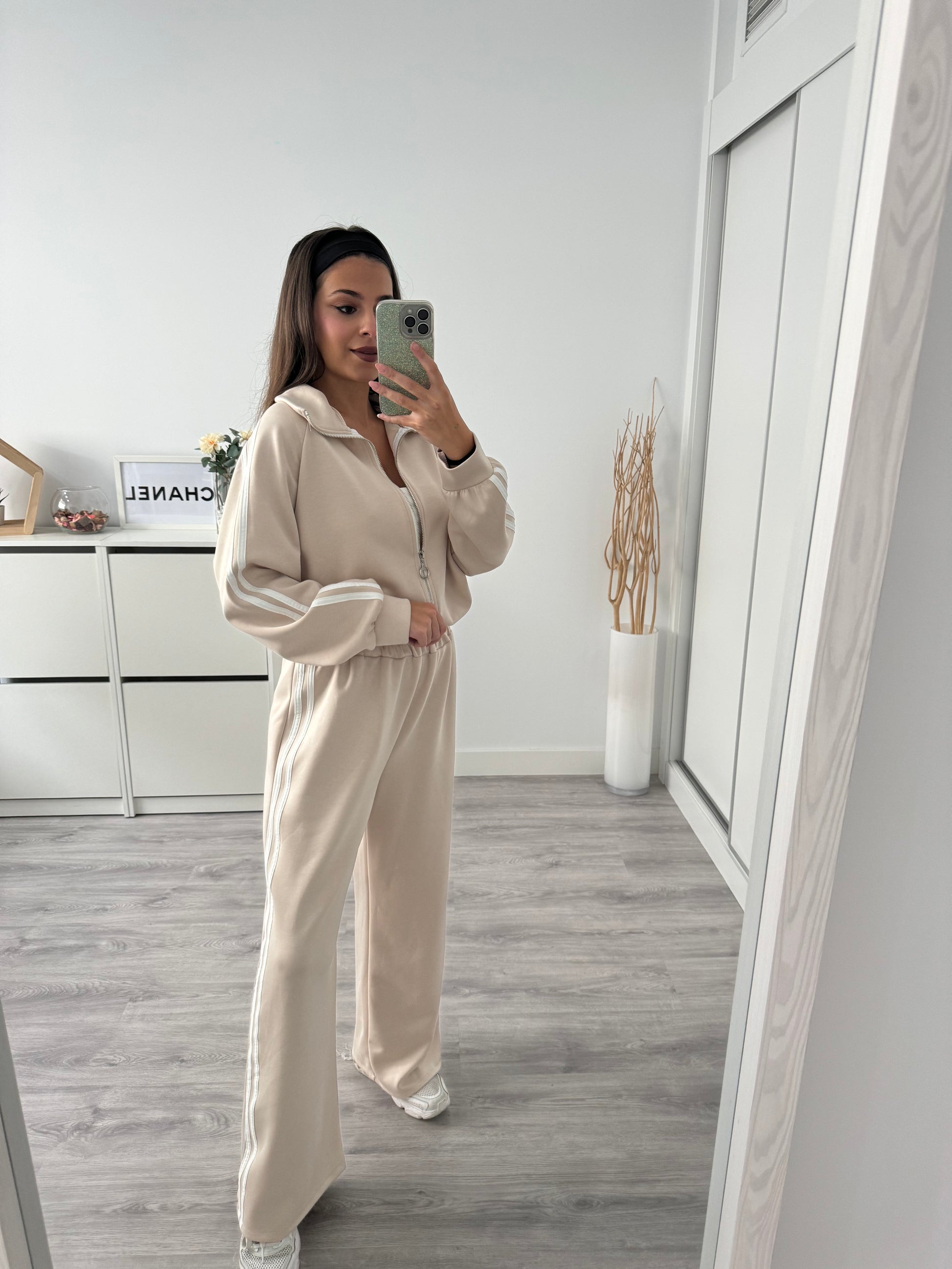 El conjunto está compuesto por una sudadera con cremallera y cuello alto de inspiración deportiva, y un pantalón de tiro alto con corte recto que estiliza la silueta. Las líneas laterales en contraste aportan ese toque moderno que eleva cualquier look casual.