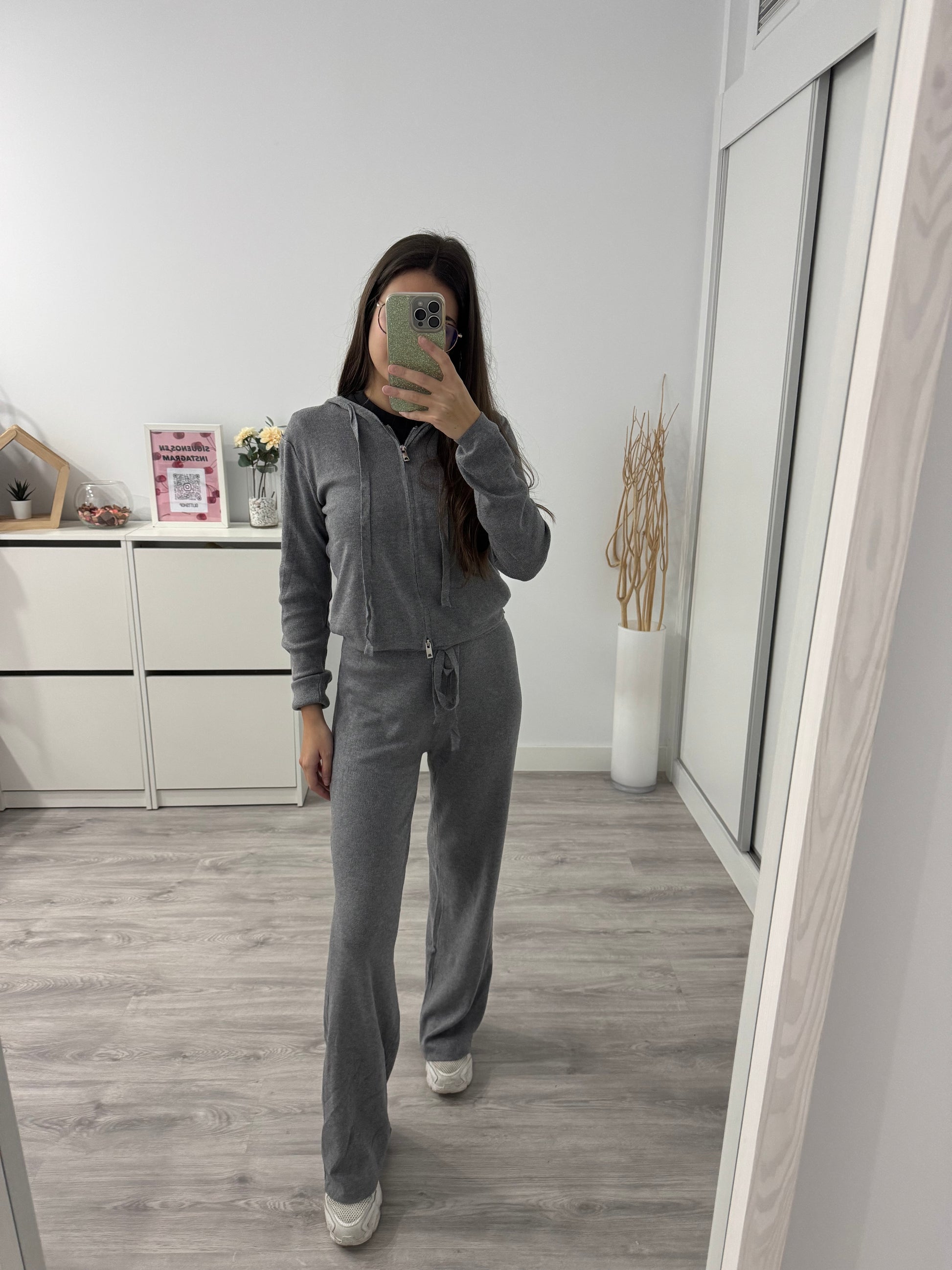 El conjunto está formado por una chaqueta con cremallera y capucha ajustable, ideal para un toque deportivo y casual, y un pantalón de tiro alto con cordón regulable y corte recto que estiliza la figura sin renunciar al confort.