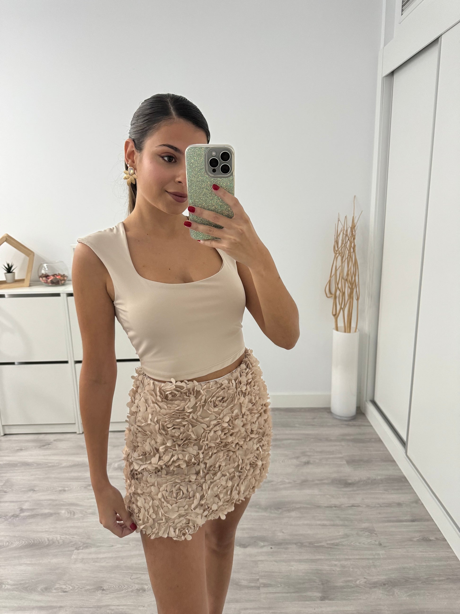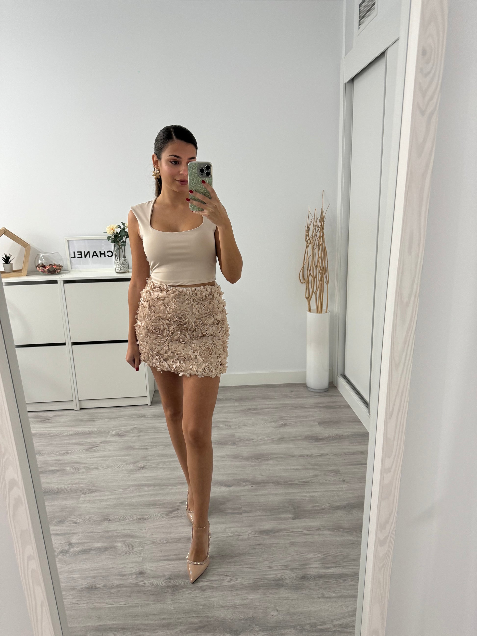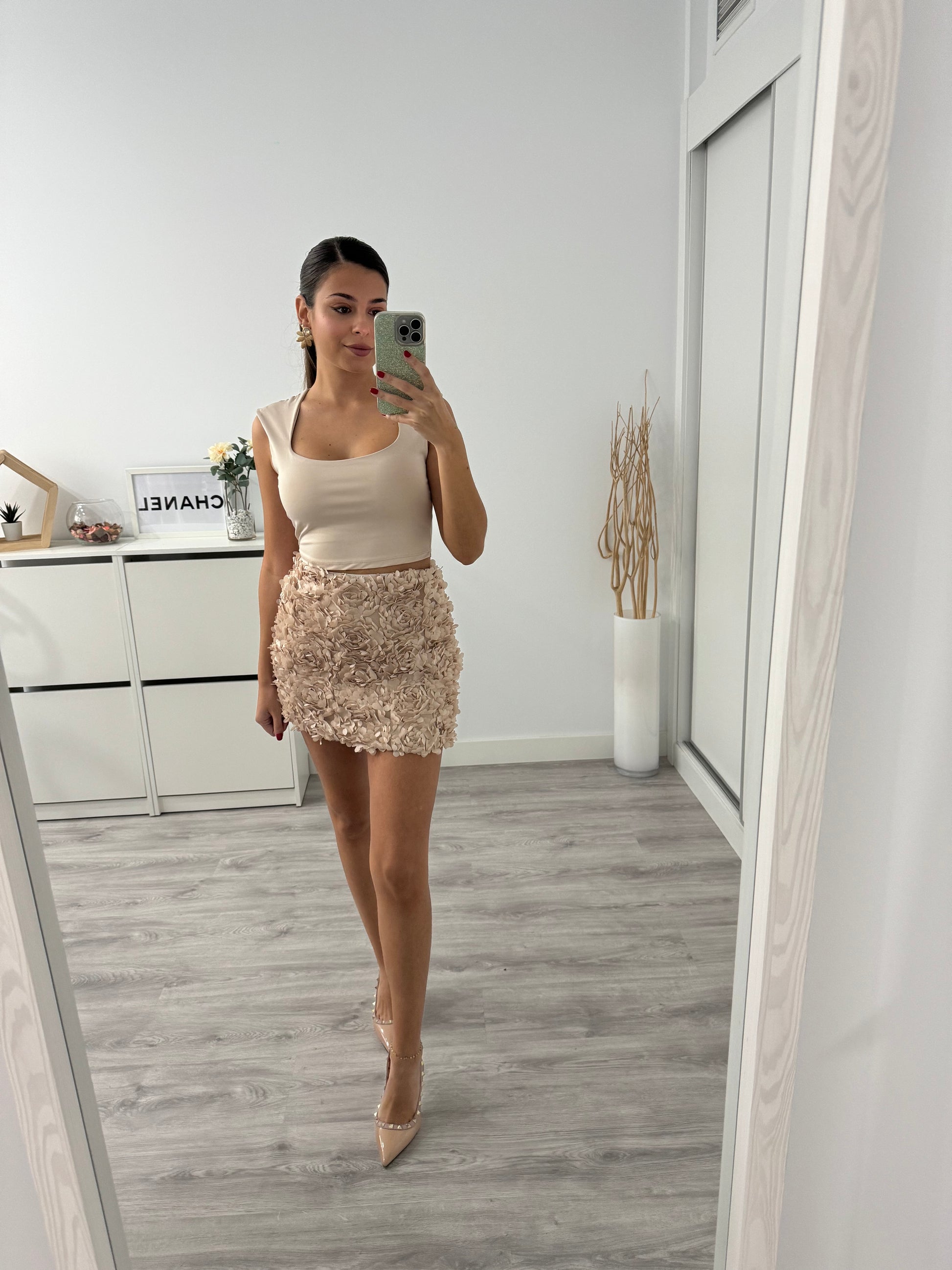 La Falda Melania es una pieza única que combina delicadeza, textura y elegancia. Su diseño mini con flores en relieve crea un efecto tridimensional que aporta volumen y movimiento, haciendo que destaque con luz propia.