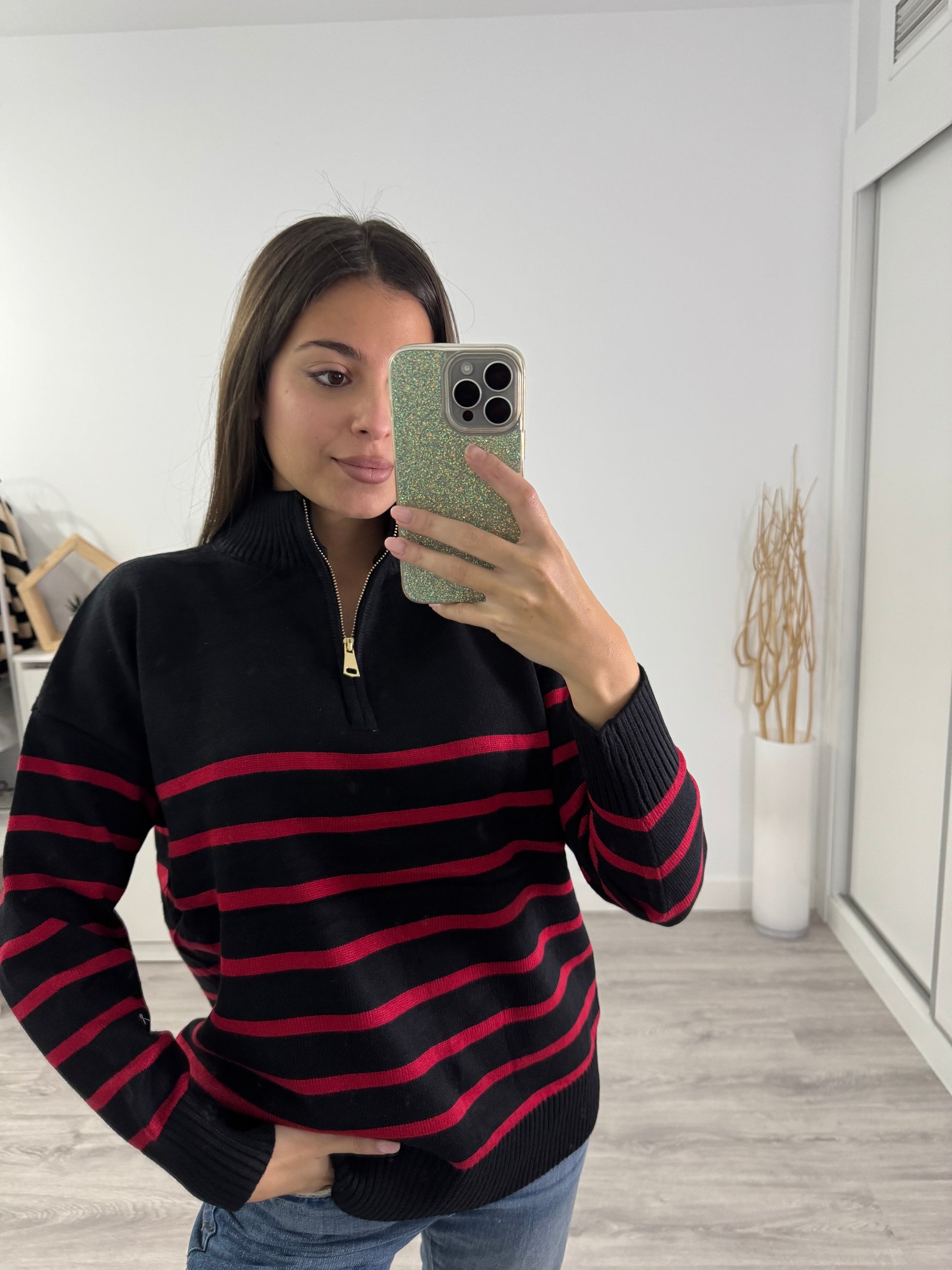 El Jersey Manuela es ese imprescindible que combina estilo, comodidad y un aire chic que nunca pasa desapercibido. Su diseño de rayas horizontales con cremallera en el cuello crea una prenda versátil que podrás usar durante todo el año, desde los días más frescos de otoño hasta las tardes suaves de primavera.