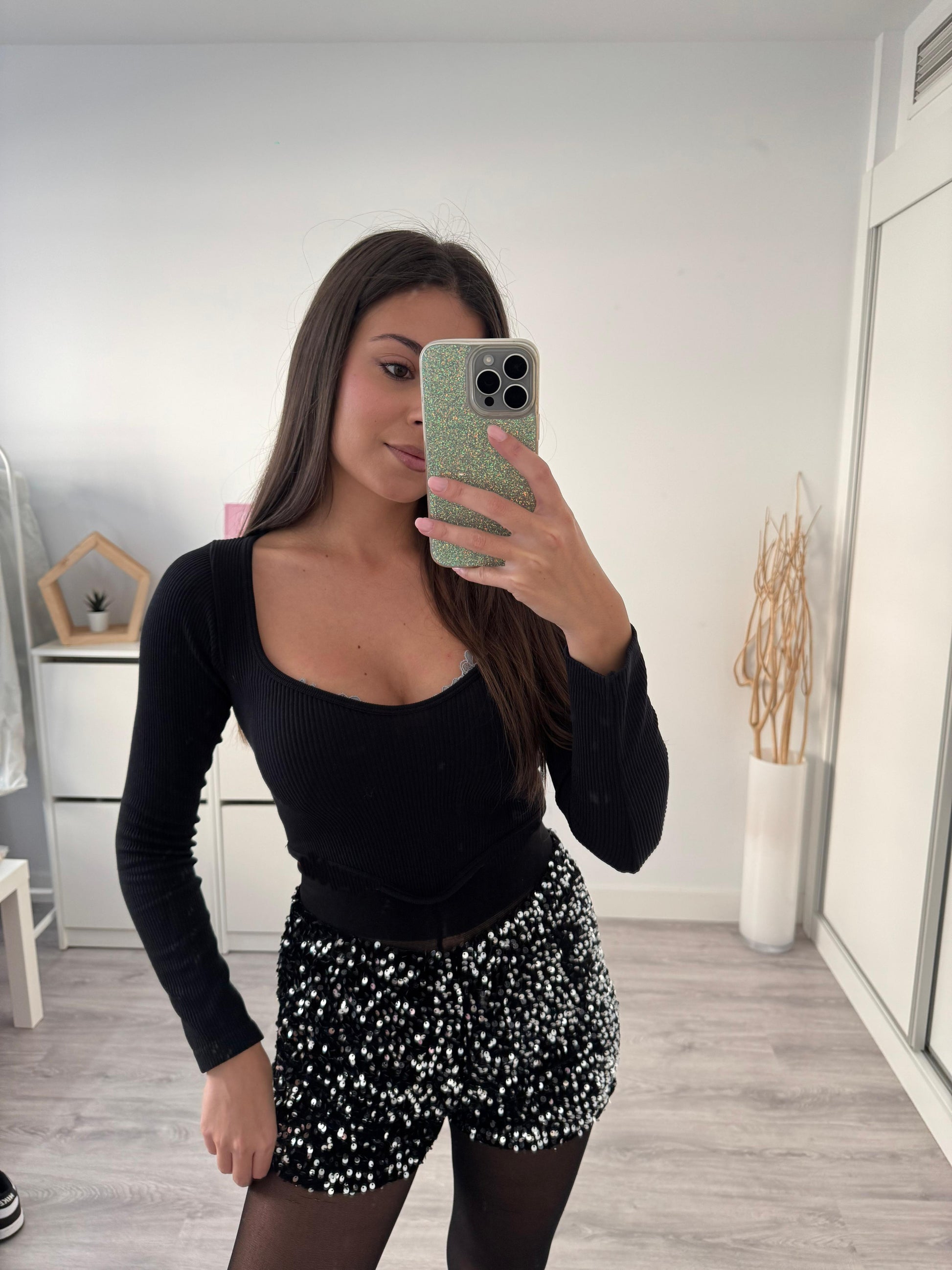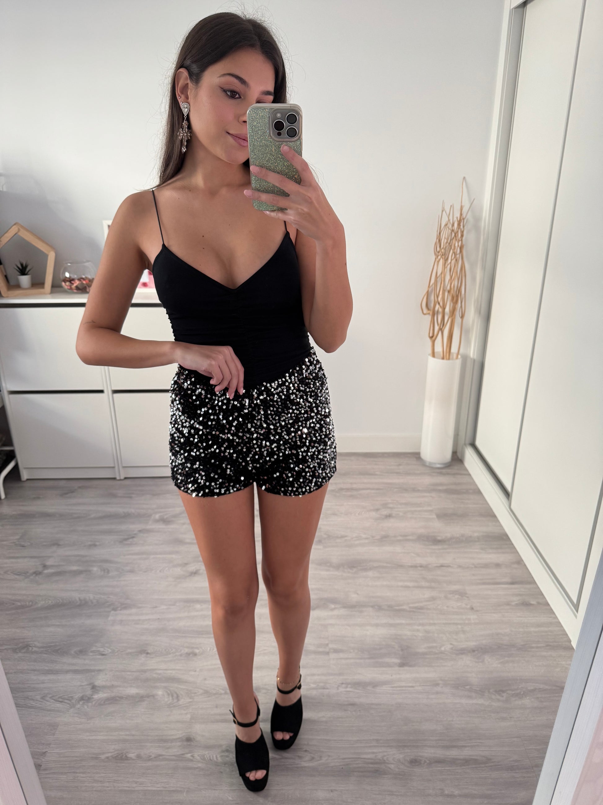Los Shorts París son una oda al brillo y la elegancia moderna. Diseñados para no pasar desapercibidos, están confeccionados en un tejido cubierto de lentejuelas que captan la luz desde cualquier ángulo, creando un efecto luminoso y sofisticado perfecto para eventos, noches especiales o para elevar un look básico con un toque glamuroso.