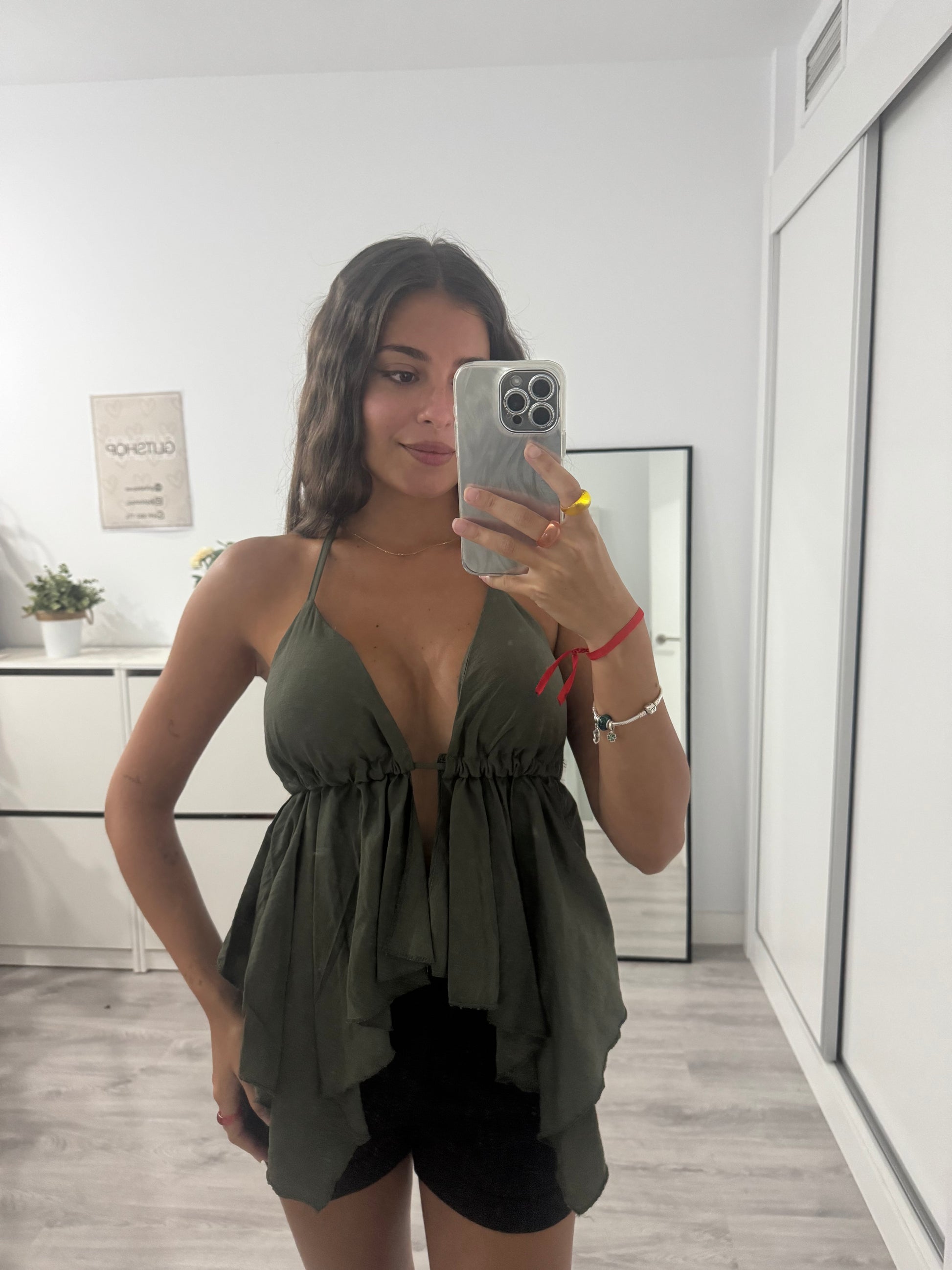 El Top Ana es la prenda perfecta para los días cálidos en los que quieres sentirte libre, femenina y con estilo. Su diseño fluido y su escote pronunciado en forma de triángulo realzan la figura con un toque natural y desenfadado.