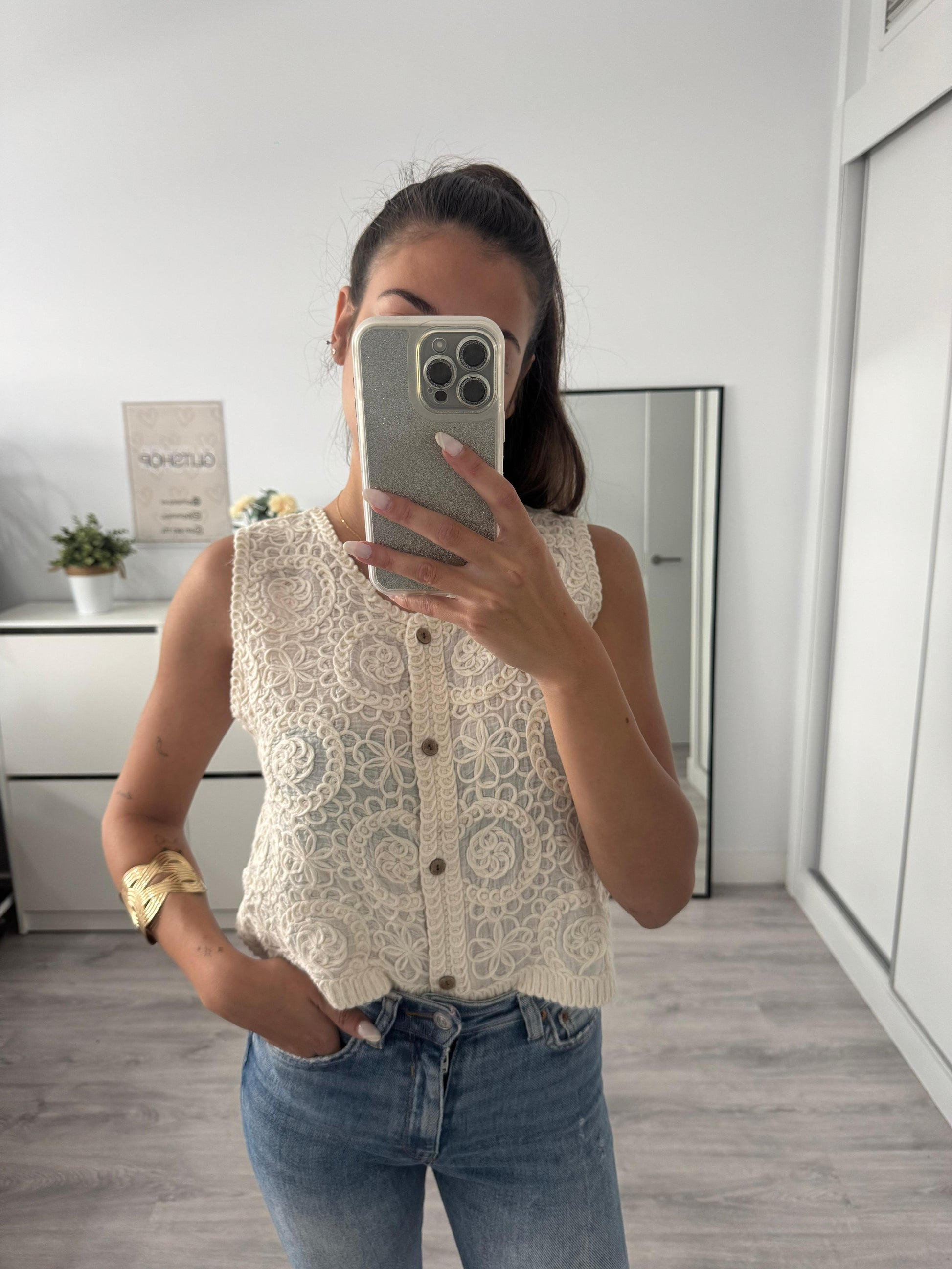 Confeccionado en un tejido calado con dibujo floral, tiene un tacto suave y un acabado artesanal que aporta un toque único a cualquier look.