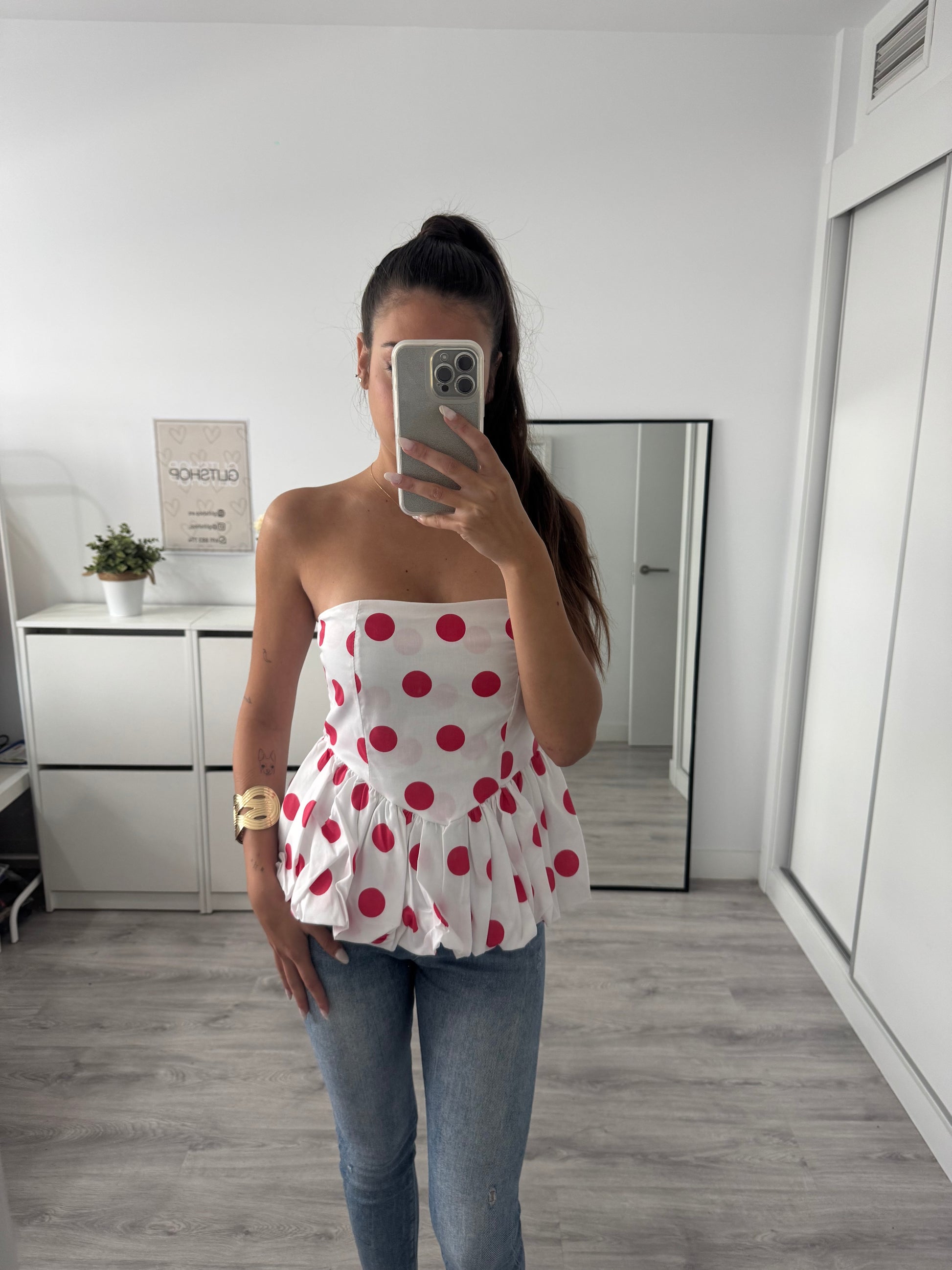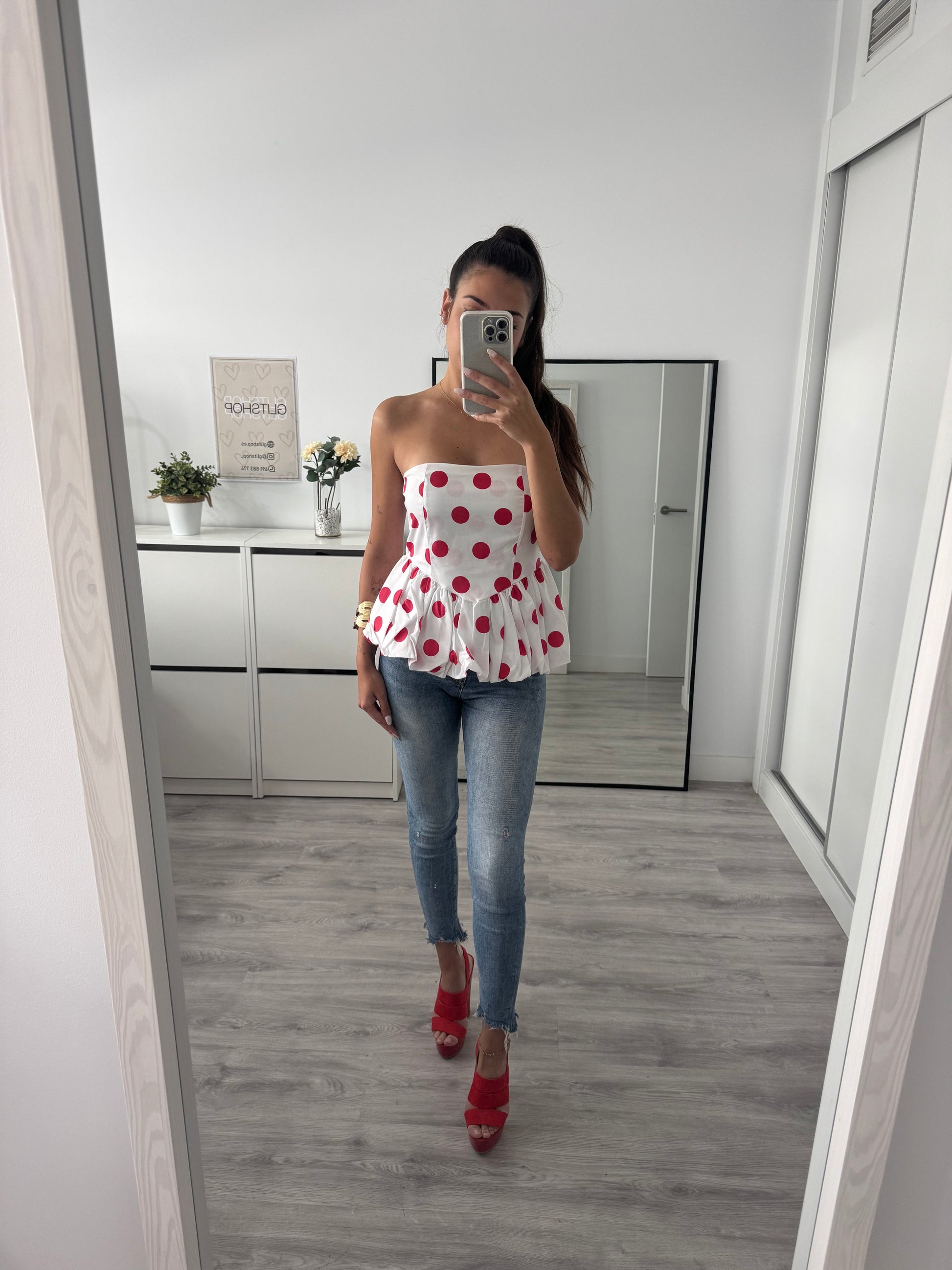 El fondo blanco con lunares rojos aporta ese aire fresco, femenino y atemporal que nunca pasa de moda. Perfecto para días soleados, cenas de verano o cualquier ocasión en la que quieras destacar con estilo y alegría.