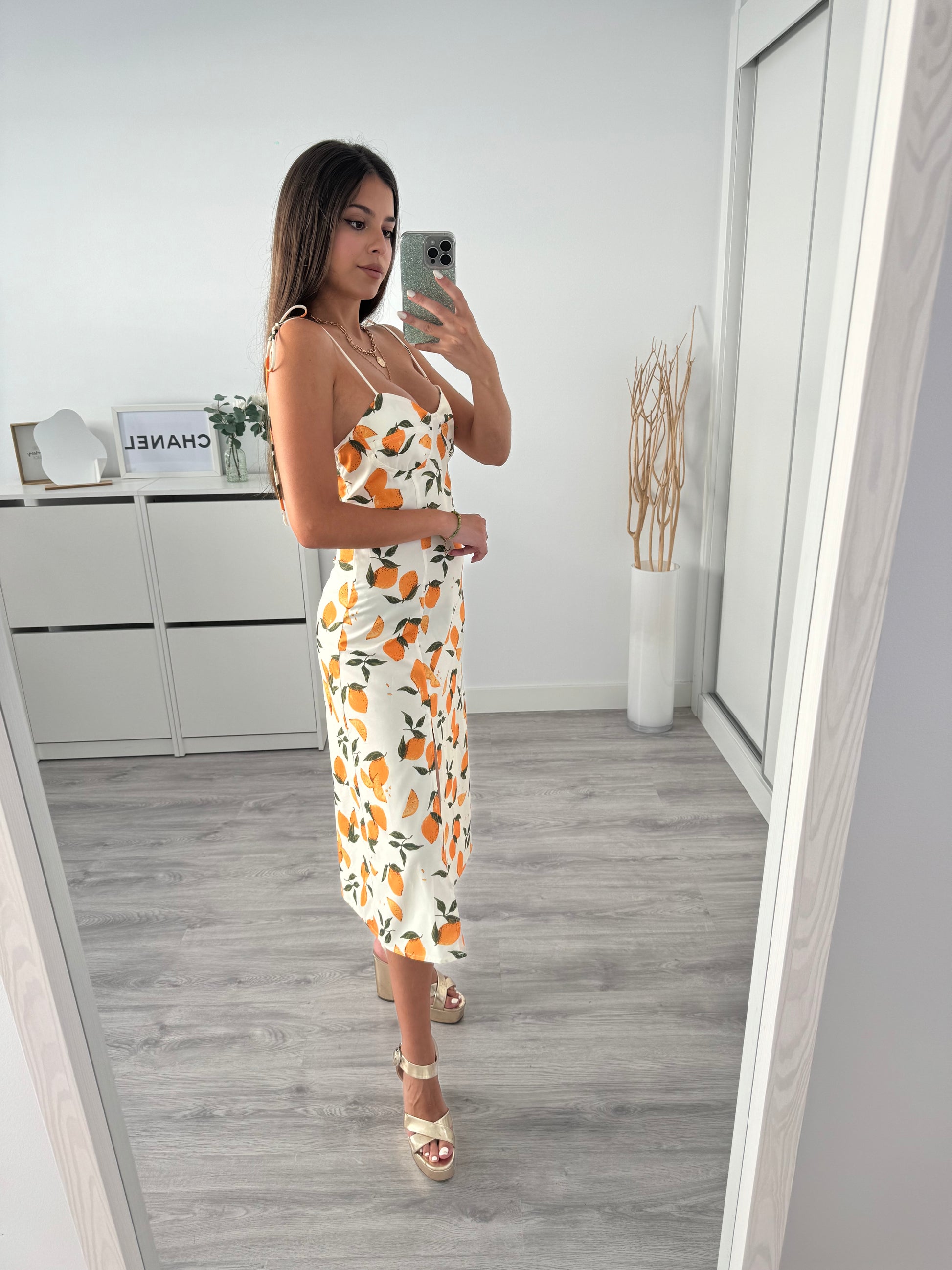 El Vestido Julia es pura frescura y encanto veraniego. Con su estampado de limones y su corte midi fluido, transmite alegría y un estilo natural que ilumina cualquier día.